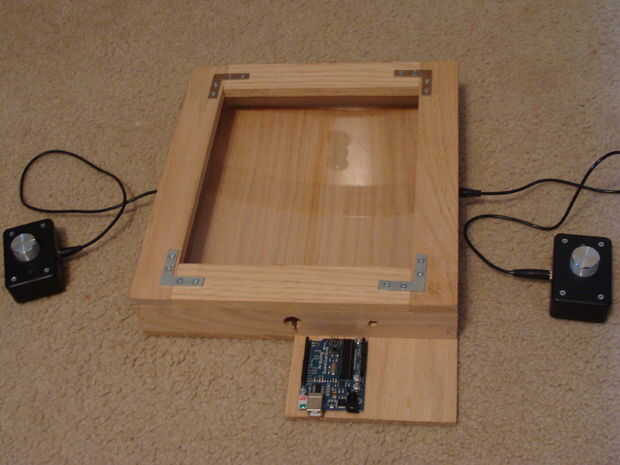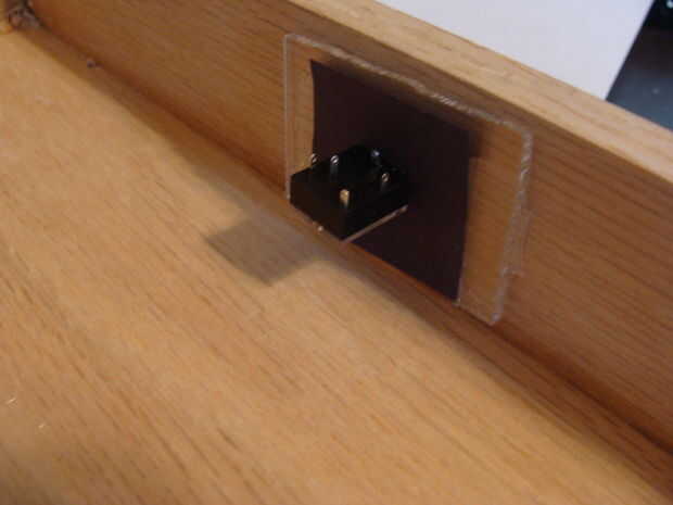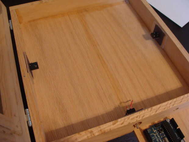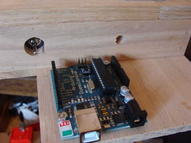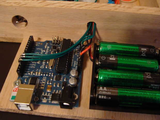 A continuación perfore un pequeño agujero sobre la plataforma en el exterior que los alambres se pueden ejecutar desde la Arduino, la batería y la electrónica interior y.