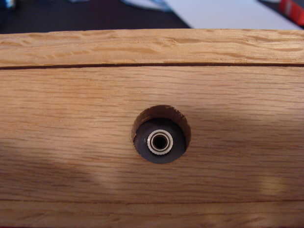 Para que 3 agujeros deben taladrarse. Hice agujeros de 5/8". Es 1 orificio en medio de la frente, izquierda y derecha. Los conectores de audio a los lados y el interruptor de alimentación va en la parte delantera. Use mi truco acrílico para adjuntarlos. El color negro puedes ver detrás del acrílico son pedazos de papel de construcción cabido entre el acrílico y el interruptor de encendido / jack de audio que se está acoplando en. Lo hice por estética cuando se ve desde el exterior.