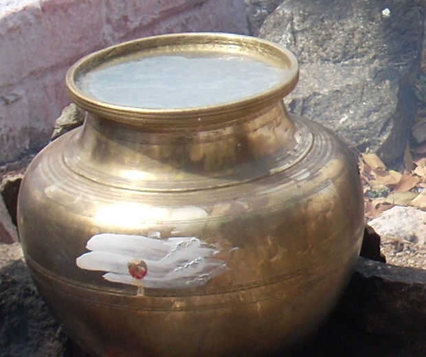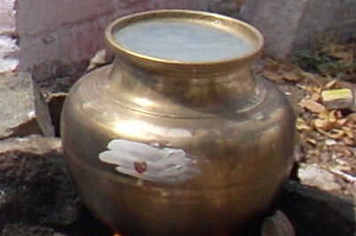 2) limpiar el pote de cobre amarillo pongal y colóquelo sobre el lugar de cocción.