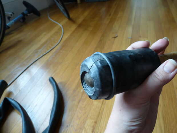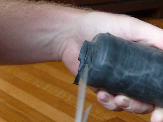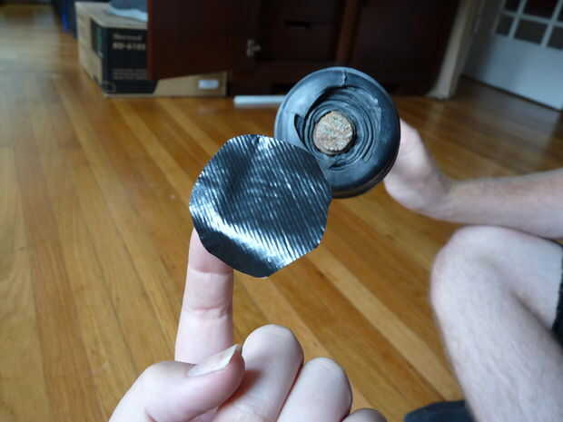 Porque pensé en esto después del hecho, revierte al final de la cubierta para exponer el extremo de la cruda, había cubierto con el pequeño disco de cinta de conducto y luego refinanciar la cubierta para un acabado final.