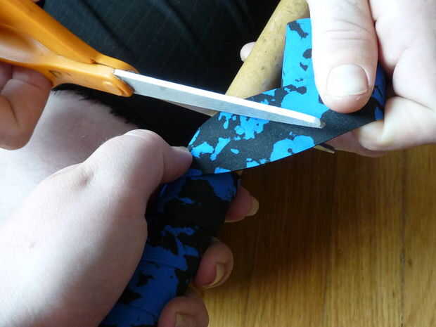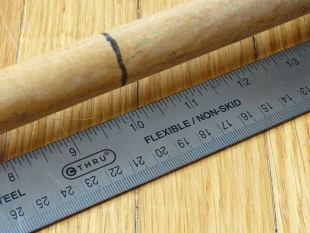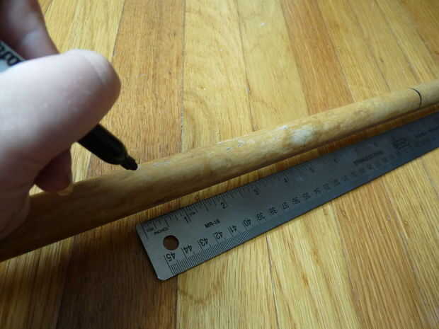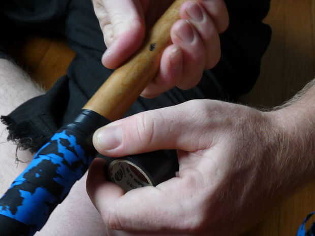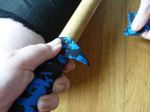 Al igual que las barras de la bicicleta de regalo. Medir distancias iguales a partir de la línea central y marque aquellos. Hice 20" de la manija, que utiliza casi exactamente un rollo de cinta de la barra. Envuelva firmemente de uno al otro, acabado con cinta aislante.