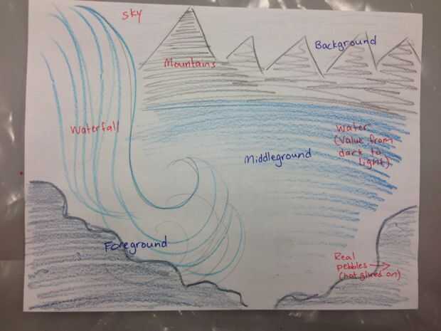 Proyecto de un bosquejo áspero de donde se encuentra la imagen. Plan de los colores y elementos de diseño que va a utilizar. También asegúrese de que se han incorporado antecedentes, medio y primer plano para crear profundidad y para hacer tu imagen viene a la vida. Además, se puede considerar agregar aspectos texturales reales a su pieza final.
