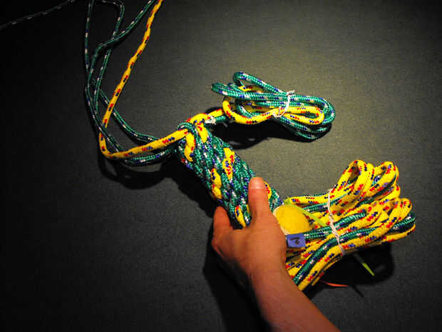2. La goma uno de los 2 grupos dejando 4 cuerdas sueltas en un lado (esto se convierte en una pierna) y paquete