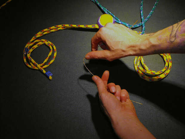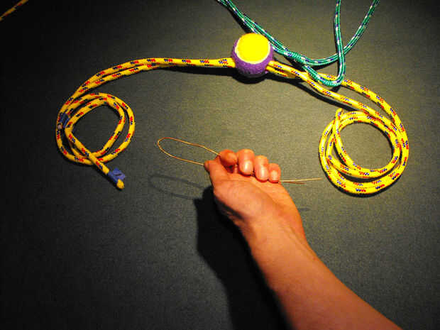 3. Inserte una 114" cuerda a través del extremo en forma de" U"de alambre y suavemente tire cable a través de agujeros de centrado de la bola de cuerda