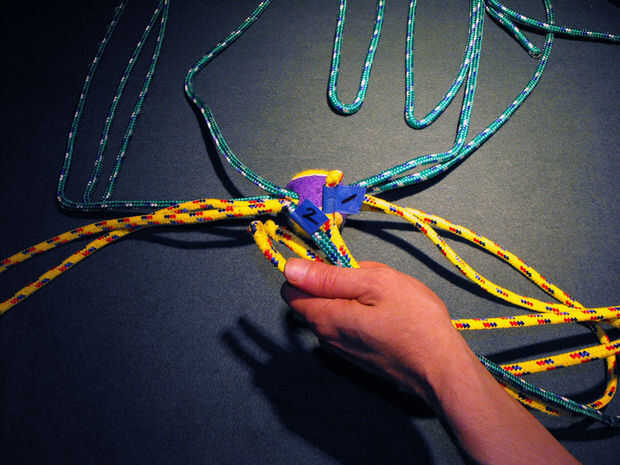 2. Inserte una 114" cuerda a través del extremo en forma de" U"de alambre y suavemente tire cable a través de agujeros de centrado de la bola de cuerda