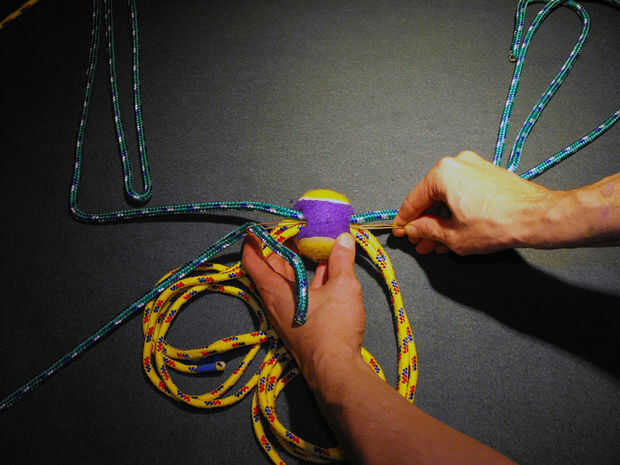 1. Alimente el alambre hacia atrás a través de ambos orificios en pelota de tenis