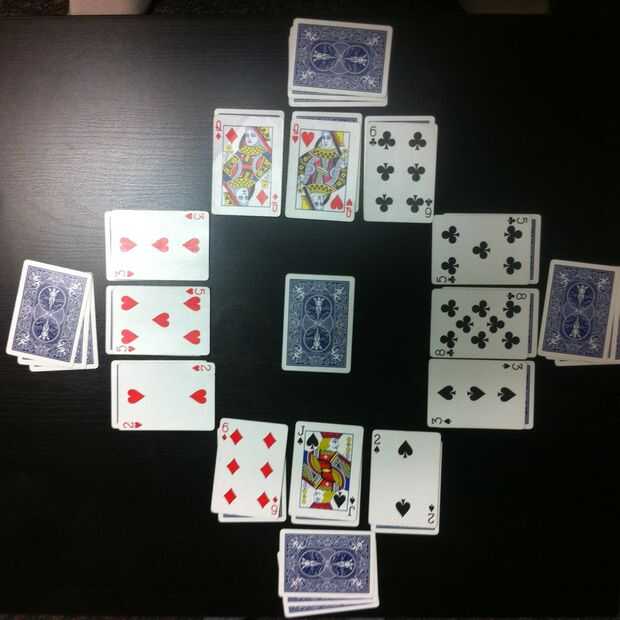 Reparte tres cartas a cada jugador y que ponga la cartas boca arriba, una encima de cada una de sus cartas boca abajo. No te fijes en estas tarjetas.