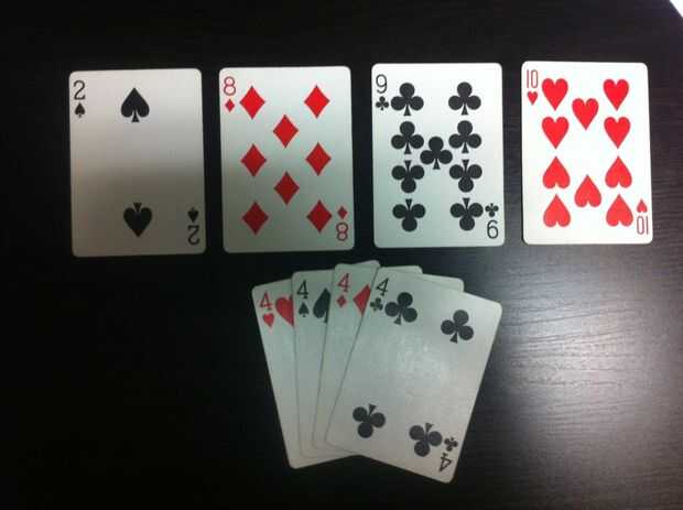 Cuatro de tipo ("bomba")-si los cuatro cartas del mismo número se tocan encima de la otra, se descarta toda la pila de tarjetas. Estas tarjetas están fuera de juego. Esto sucede si un jugador juega las cuatro, o si varios jugadores jugar la carta del mismo p. ej. Bob juega 6, Sally juega dos 6s y George juega los 6 últimos. El jugador que completa el cuatro de clase juega otra vez es decir, George.