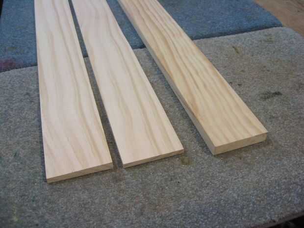 Empecé con un 8-pie largo, 4" ancho por 3/4" espesor madera de pino. Cortar en dos piezas de 4 pies y utiliza una sierra de banda para extraer una de estas mitades en dos aproximadamente 3/8" trozos gruesos.