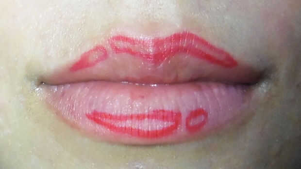 Paso 1: La reina Con rojo de mis paletas de maquillaje forever flash voy a colocar el corazón de Queens en el centro de mis labios.Paso 2: Cheshire Cat Utilizando lippie NYX en el color rosado que estoy colocando en tiras, luego tomando el color de r