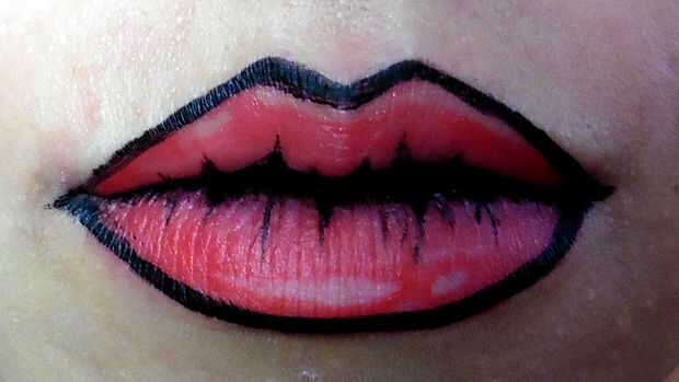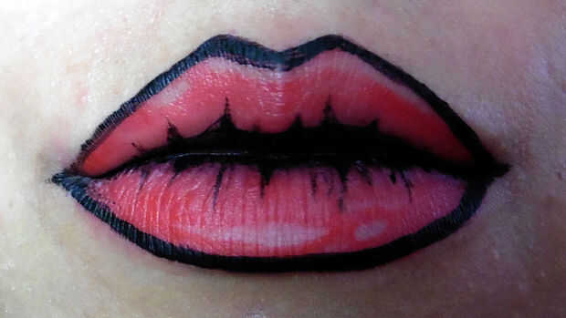 Paso 1: La reina Con rojo de mis paletas de maquillaje forever flash voy a colocar el corazón de Queens en el centro de mis labios.Paso 2: Cheshire Cat Utilizando lippie NYX en el color rosado que estoy colocando en tiras, luego tomando el color de r