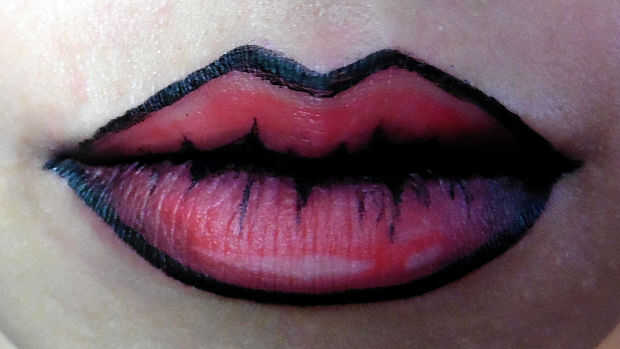 Paso 1: La reina Con rojo de mis paletas de maquillaje forever flash voy a colocar el corazón de Queens en el centro de mis labios.Paso 2: Cheshire Cat Utilizando lippie NYX en el color rosado que estoy colocando en tiras, luego tomando el color de r
