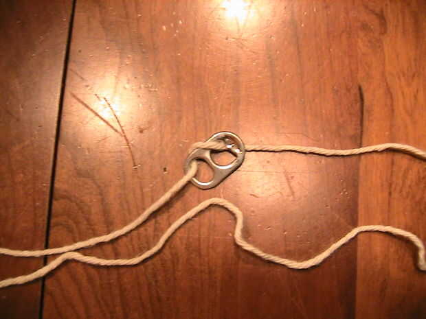 colocar la cuerda en el orificio más pequeño, alrededor de la parte hacia arriba y abajo a través del agujero grande.