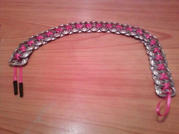 5. cruzar las cuerdas y añadir una tercera pestaña, asegúrese de poner la cadena a través de él y la segunda pestaña. Esto formará una "X" en la parte posterior de la correa.