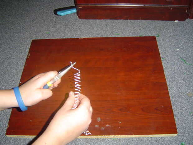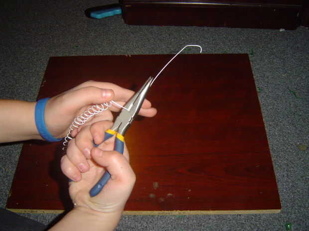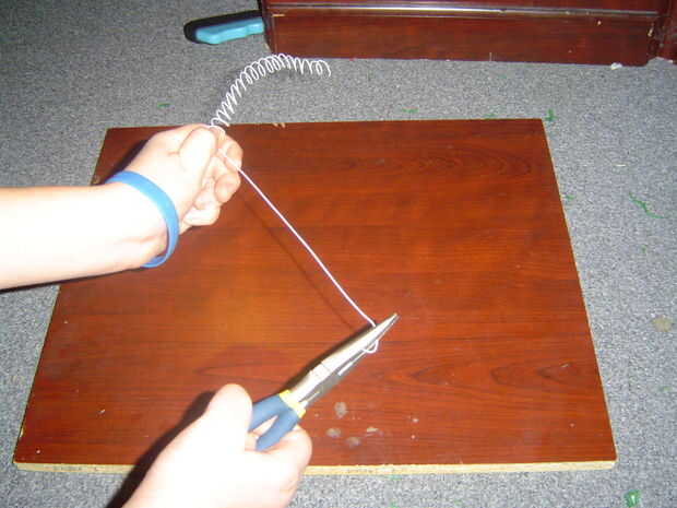 en este paso tomar pinzas de punta de la aguja y el hilo y poner las pinzas en el extremo de un hilo y los dedos donde comienza la bobina. A continuación, deslice dedo abajo el cable para un wire.than plano y recto después de enderezar el alambre, cortarlo a la longitud que desee.