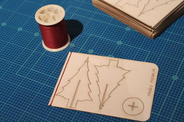 Saltar las tarjetas, teniendo cuidado de no saltar árboles mientras estás en él. Ate una cuerda alrededor de un extremo de la tarjeta. En mi diseño incorporé una pequeña lengüeta en el perfil de la tarjeta por este motivo concreto.