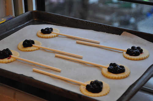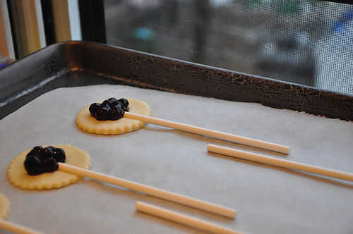 Posición de la caja fuerte del horno los palillos para que el borde superior de la palanca es sobre a mitad de camino hasta el corte de tarta y presione hacia abajo suavemente. Rellenar con aproximadamente una cucharada cafetera o un poco más de relleno.