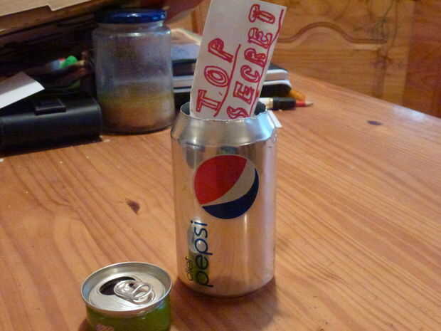 Este pop puede caer muerto se ve como un vacío normal puede arrojó descuidadamente a un lado, pero es realmente un oculto "seguro" ocultar los objetos de valor y los archivos secreto superior. Usando un viejo envase de la especia, gire la parte superior de la lata en una tapa roscada que se abre y se cierra. La tapa rosca esconde la costura muy bien por lo hermanos peeving ni enemigos pueden robar sus archivos secretos y dinero. Además, si algún transeúnte toma el poder, nunca descubrirán la profundidad de sus secretos. El pop puede muerto es la herramienta perfecta para transferir sus archivos y se construye fácilmente con sólo unos pocos materiales y suministros.