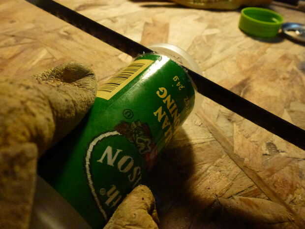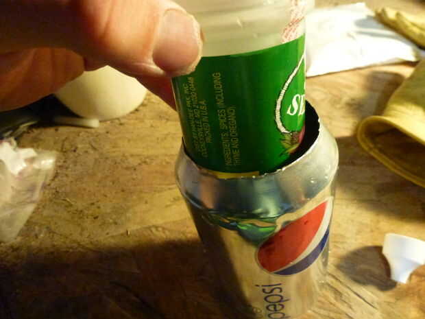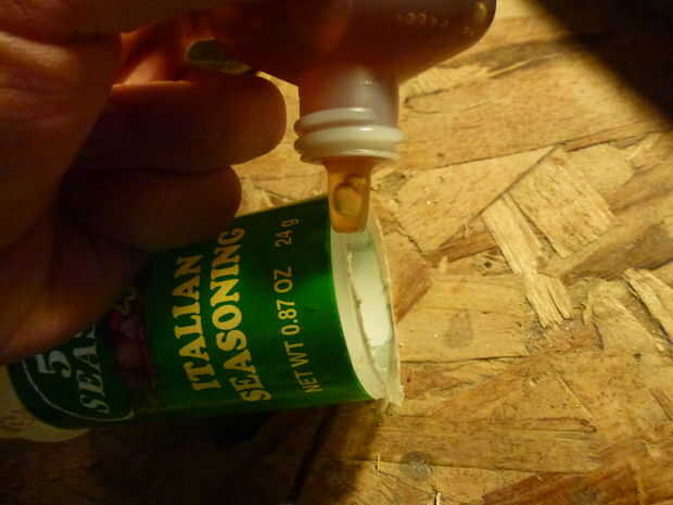 Es el momento de comenzar a añadir las roscas. Retire la tapa de la especia, envase y ponerlo a un lado para su uso posterior. Tomar el envase de la especia y corte el labio inferior o aproximadamente 1 cm. archivo del corte si tiene rebabas grandes. A continuación, con el pegamento gorila, poner una pequeña línea de pegamento en el borde cortado de la especia, envase. No necesita mucho pegamento porque el pegamento gorila se expande 3 - 4 veces lo que pones en el. Inserte el envase de la especia en el pop puede y presione firmemente contra el fondo de la lata. El envase de la especia debe quedar centrado en el centro de la lata. Poner un peso en la parte superior del contenedor o cinta adhesiva del especia, envase de la lata para mantenerlo en su lugar mientras el adhesivo se seque.