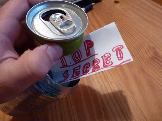 pop puede top/especia la tapa del contenedor y guíelo hacia el pop puede. La especia, envase y la tapa deben estar alineados. Atornillar las dos piezas firmemente. Estás acabado. Si los cortes rectos y la especia, envase de centrado, la tapa debe encajar y hacer el corte casi inexistente. Llene su gota muerta con nada. Archivos secretos, dulces, dinero, etc.. Organizar un lugar para "soltar" tu dead drop con sus compañeros spies y dejar que el pop puede allí. Ahora tienes un pop puede caer muerto para ocultar y transferir sus archivos secretos. El pop puede caer muerto se ve como un estallido vacío puede a esos ingenuos a tus secretos, pero que sus espías, la caída muerta es una herramienta útil para ocultar y transferir un tesoro de nada de archivos secretos a candy.