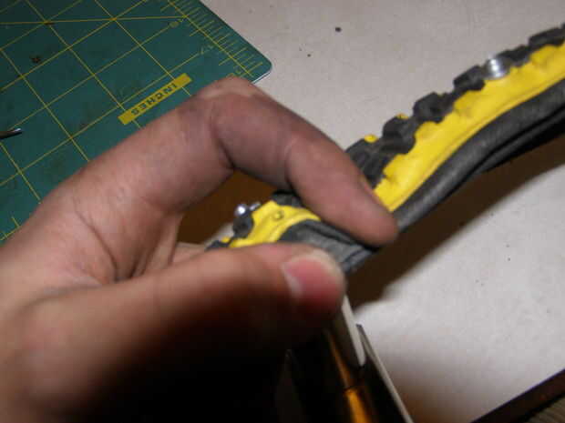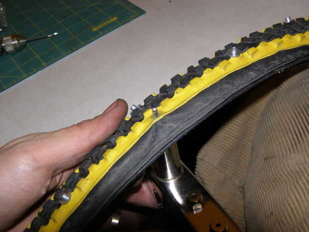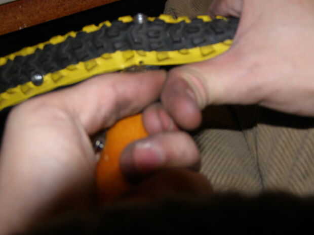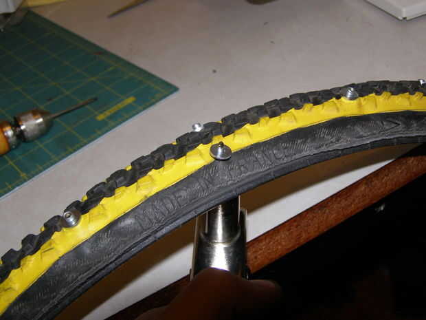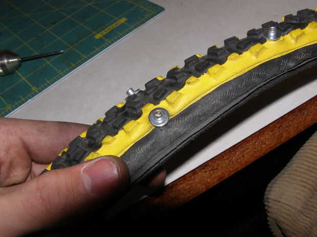 Finalmente, cargar una arandela en el cuerpo del remache fuera del neumático y fijar el remache. Deje un pedazo afilado pegando de la lavadora que es buena para morder en el hielo.