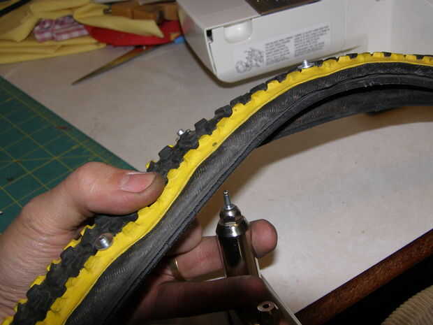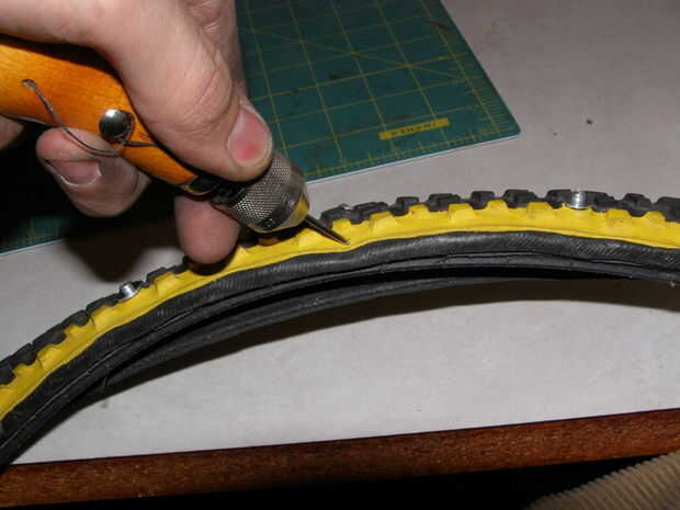 Luego cargar un remache en la herramienta de remache y retorcerse a través del agujero desde el interior de la llanta, otra vez, intenta llegar entre las cuerdas de neumáticos y no les. Si esto es demasiado difícil, trate de encontrar un punzón más grande.