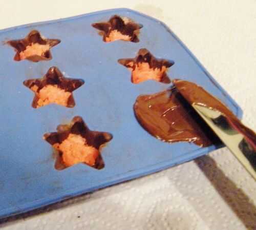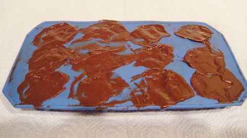 Coloque la bandeja en el congelador para enfriar y endurecido el chocolate rápidamente.