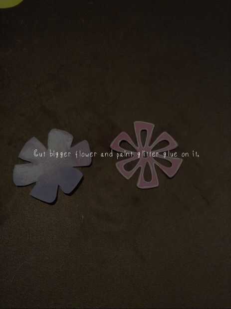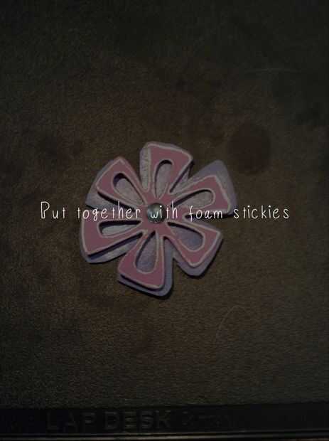 Hacer otra flor sin los agujeros y un poco más grande con la púrpura más oscuro. Pegarlas entre sí con bombas lapa de la espuma y añadir una joya para el centro.