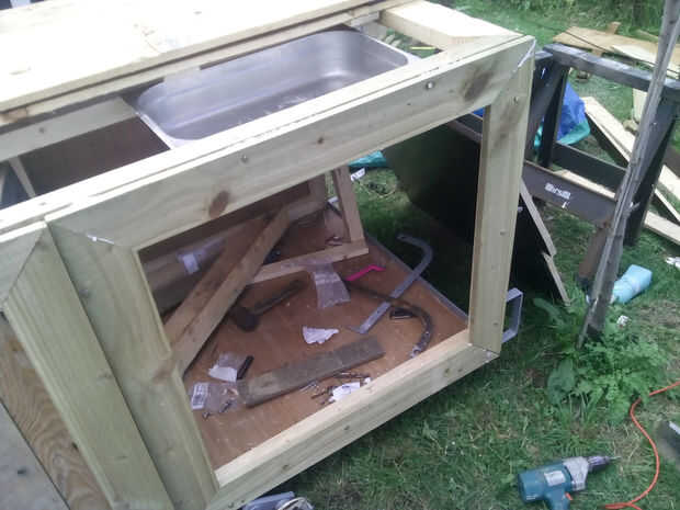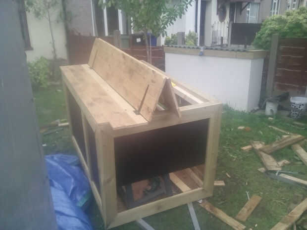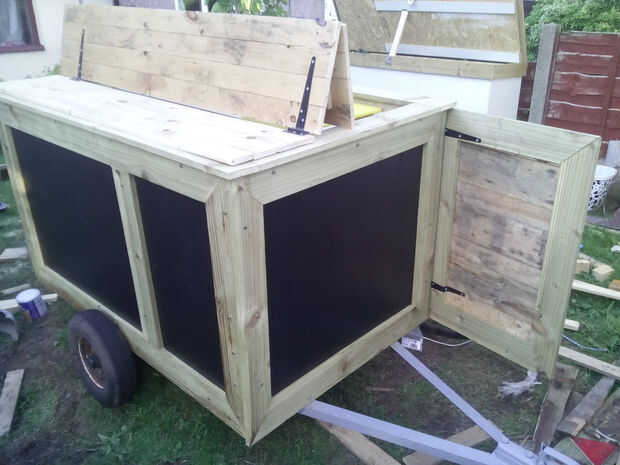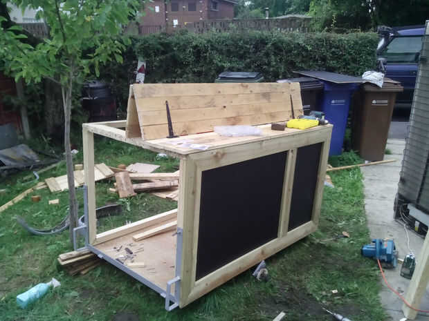 Utilizando tablones tratados hizo Marcos de los laterales y frontales y adjuntas utilizando pegamento y entrenador de tornillos. para el centro pintar capas marinas con tiza tablero pintura y pegado y atornillado por detrás.