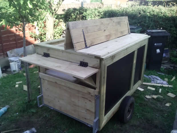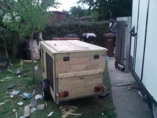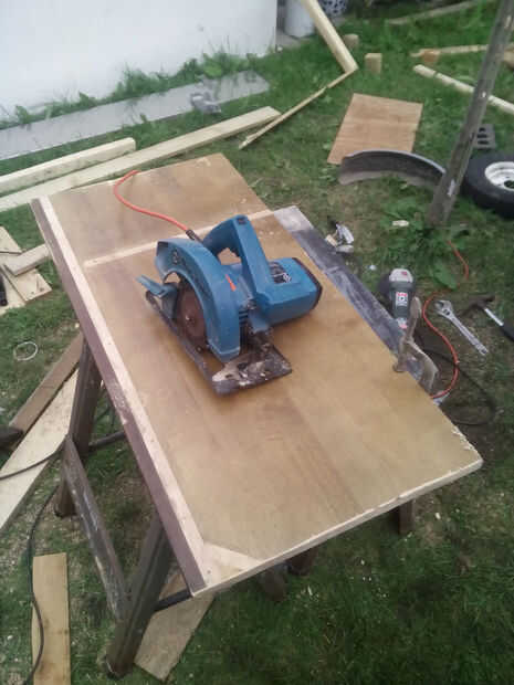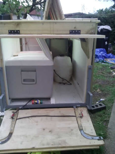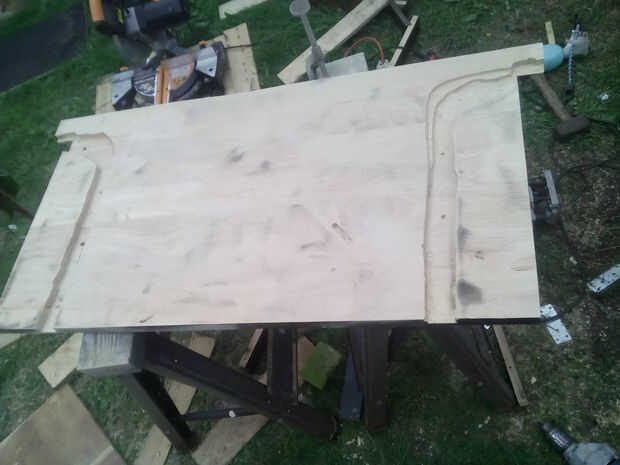Para la puerta de atrás usé y antigua mesa de comedor. Había cortado a la medida, routered hacia fuera de la ranura para las bisagras de la puerta del fondo y agrega las bisagras de metal, luego agregué un labio con una pieza de la plataforma.