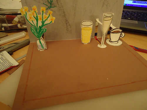 Después cuidadosamente aplicado pegamento a la longitud de los soportes y aplica el florero, la do, la Copa de champán y la taza de café.