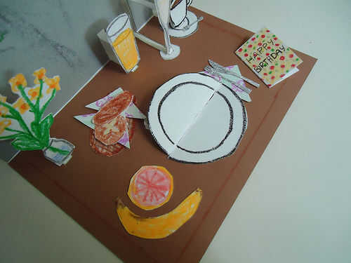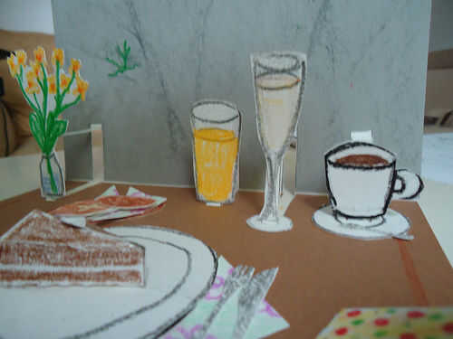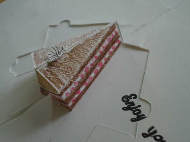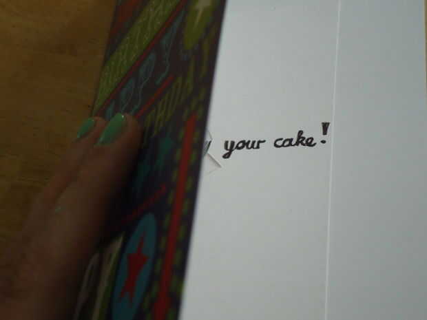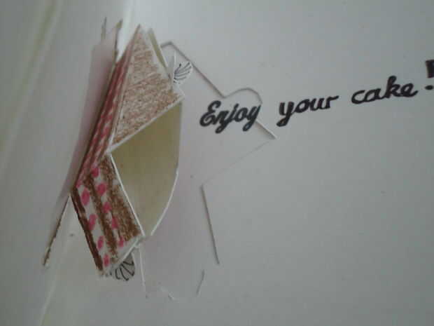 El diseño emergente de la torta sí mismo también puede ser derribado de un trabajador por cuenta ajena en una tarjeta de cumpleaños más simple y genérica. Abre, dobleces planos y revela un fantástico trozo de tarta selva negra. Yum!