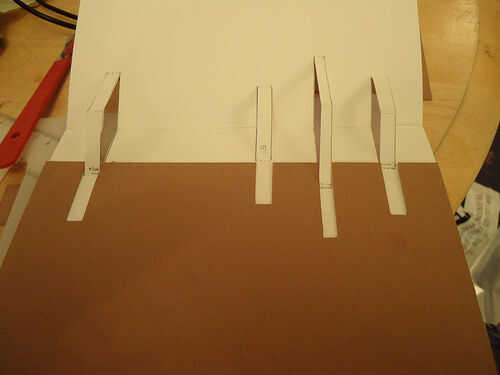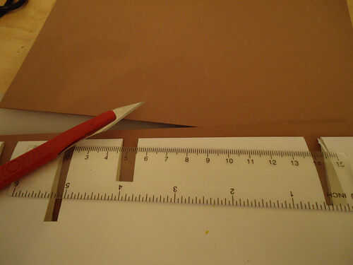 Tome sus A5 hojas de cartulina en contraste y, usando la tarjeta de base como una plantilla, seguimiento de las mismas ranuras que usted anotó en la tarjeta base. Recorto, posiblemente haciéndolos sobre un milímetro más ancho y más largo para facilitar el ajuste de alguna manera. Con la tarjeta de contraste, también cortar la base de la ranura y tire el punchout.