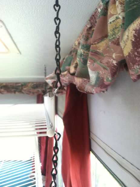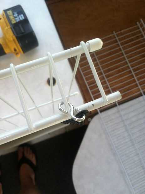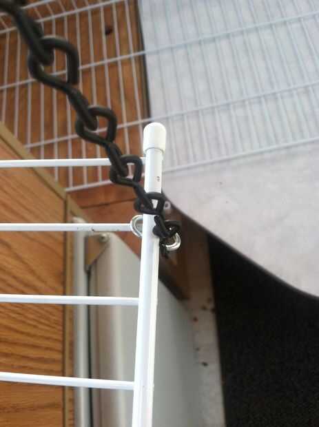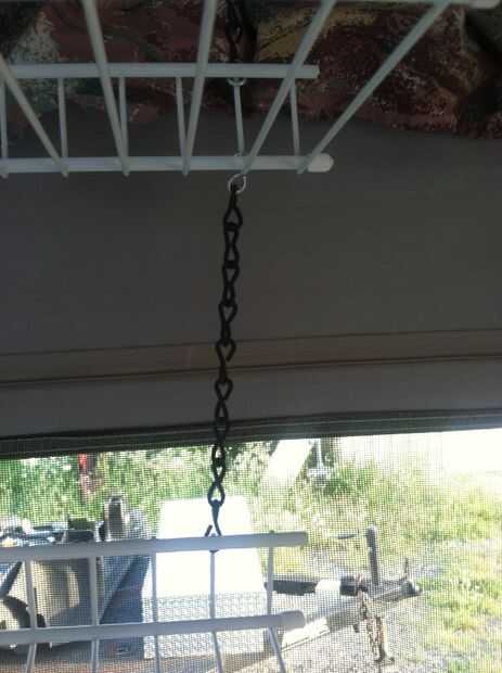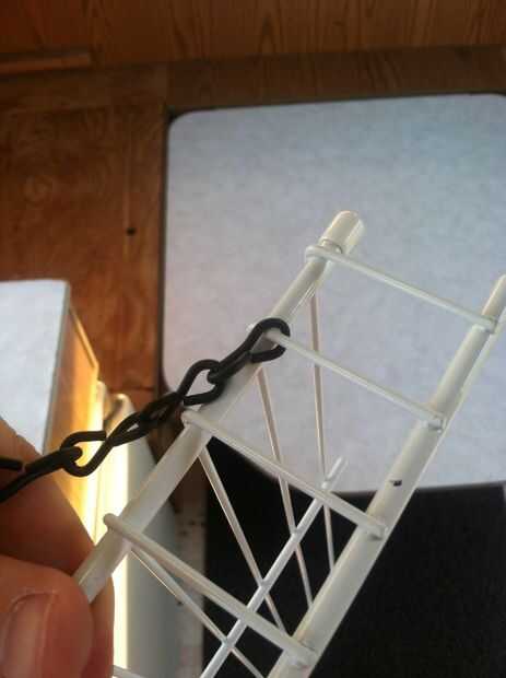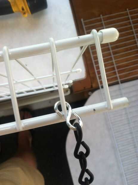 Sea necesario para asegurar que los estantes pueden quitarse rápidamente para que plegar pero cadena suficiente colgar ponemos una curva de 90 grados en unos ganchos de S. Después de hacer esto sin embargo nos dimos cuenta que podríamos haber hecho lo mismo con un enlace si cadena. Entonces nos habían aplastado unos ganchos de S a la cadena para que el segundo estante se cuelga de la primera, pero es opcional. Colocamos las cadenas para ir alrededor de la espalda me. La parte posterior y alrededor de la parte delantera en la parte delantera para que la cadena no se desliza sobre el cable de la plataforma. Para el otro estante utilizamos realmente la cadena y me gustó mucho el resultado.