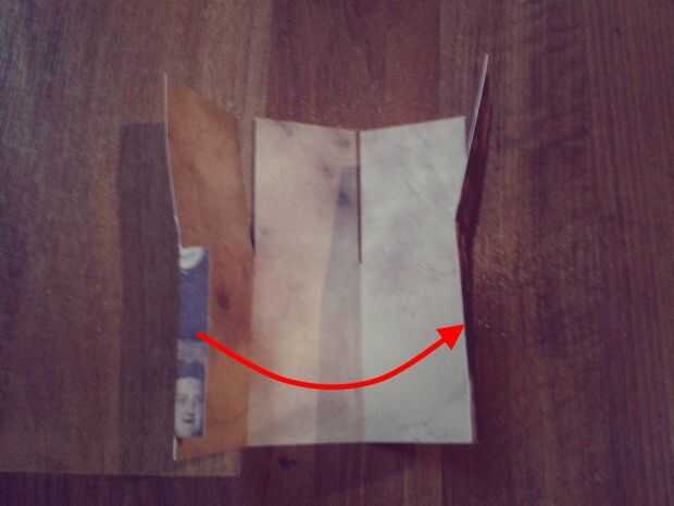 Pliegue las líneas abajo de la parte inferior la mitad de la tarjeta para crear una forma de caja, también plegable sobre la aleta pequeña en el borde