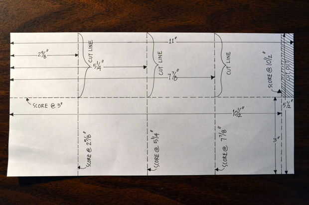 Tome 5-1/2 "x 11" de Marfil cartulina y marcador en 2-5/8", 5-1/4", 7-7/8" y 10-1/2" en la parte 11". Puntuación en 3" 5-1/2" lado.