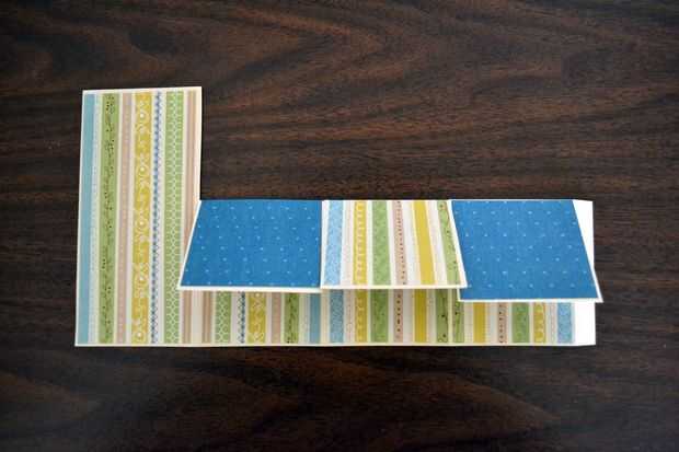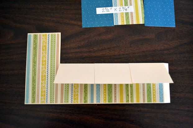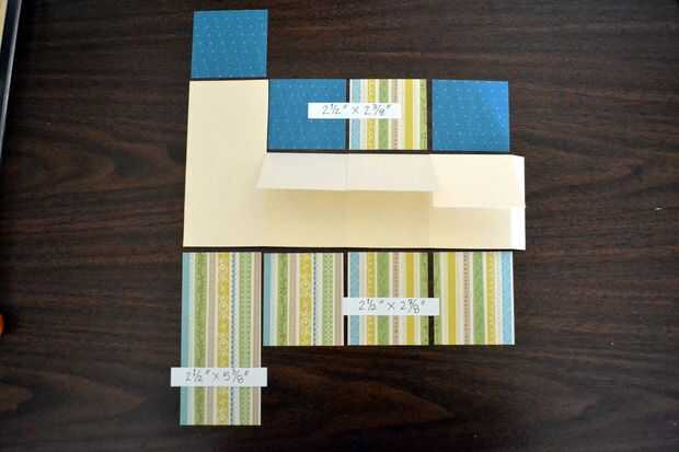 Cortar el papel de diseñador en las siguientes dimensiones: 1 tira de 2-1/2 "x 5-3/8" y 3 tiras de 2-1/2 "x 2-7/8".