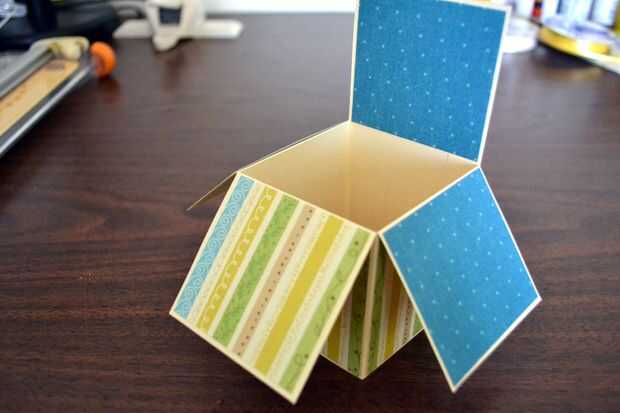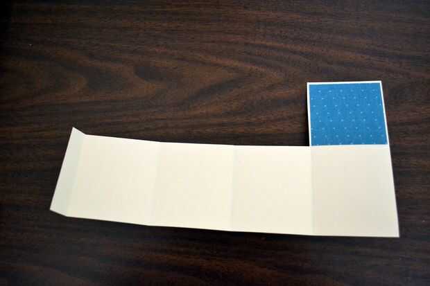 Cortar 3 tiras de tamaño 2-1/2 "x 2-3/8" del libro diseño y pegar en las aletas dobladas.