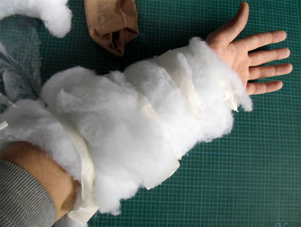 Algunos delicadeza es necesaria para asegurar que tus músculos no son bultos. Armas para mantener el bateo en lugar de cinta, y luego cubrir los antebrazos con las medias. Usé dos medias para cada brazo para ayudar a ocultar la cinta de enmascarar y guata blanca.