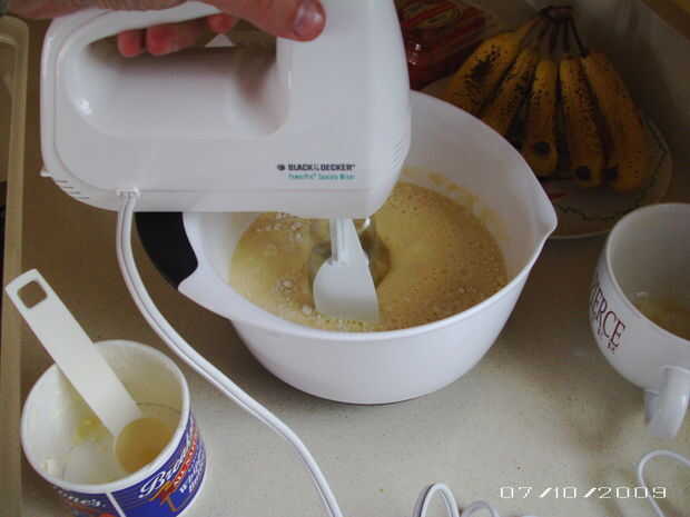 Ok estamos listos para un gran paso, mezcla el mojado y seco. Vierta lentamente la humedad en el seco. No sé por qué pero eso es lo que tienes que hacer... tan solo hacerlo de esa manera. Inicio una vez combinado, mezcla, mezcla por aproximadamente dos minutos o hasta que la mezcla realmente. Asegúrese de que usted raspe las paredes también. He hecho esto con un wisk, así como una batidora eléctrica. Ambos funcionan bien.