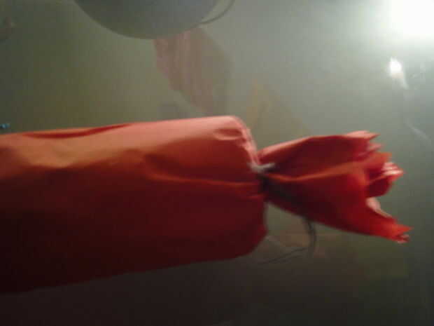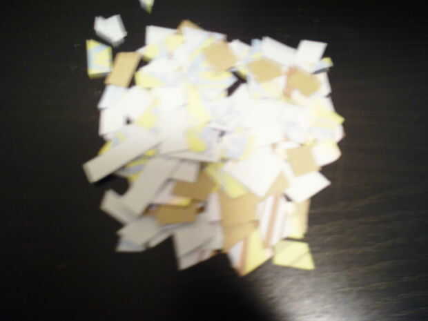 - Cerca de lazo un lado el papel de seda con la cadena. Luego, llenar el otro lado del papel con confeti o cualquier cosa de su elección. Hice el confeti por cortar pedazos de papel.