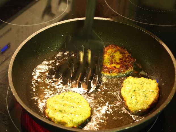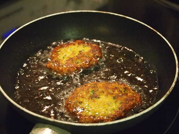 2. Freír las hamburguesas por caer en una cucharada llena en un momento para hacer una empanada cerca de 2,5 pulgadas a través. 3-4 empanadas se pueden cocinar en una sartén al mismo tiempo