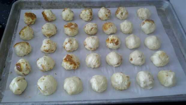 Cuchara bolas del tamaño de una pelota de ping-pong del cheesecake en el plato de la hornada, rodar entre las manos para conseguir smooth(ish) y colocar en la bandeja.