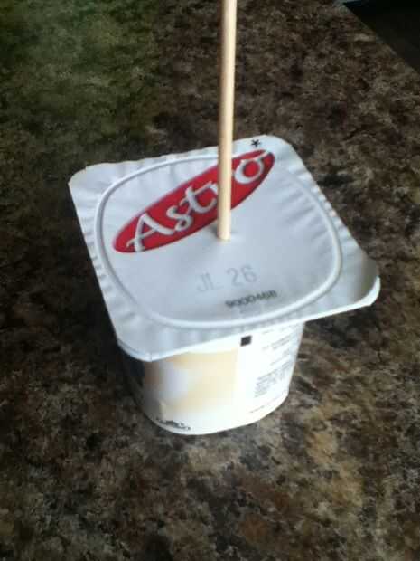 Tomar el pincho y pegarlo en el centro del envase de yogur.