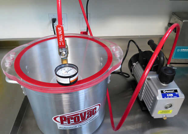 La cámara de vacío se utiliza para quitar el aire de materiales de alta viscosidad como nuestra silicona Sorta claro 40, por lo que podemos acabar con bastidores libre de burbujas.