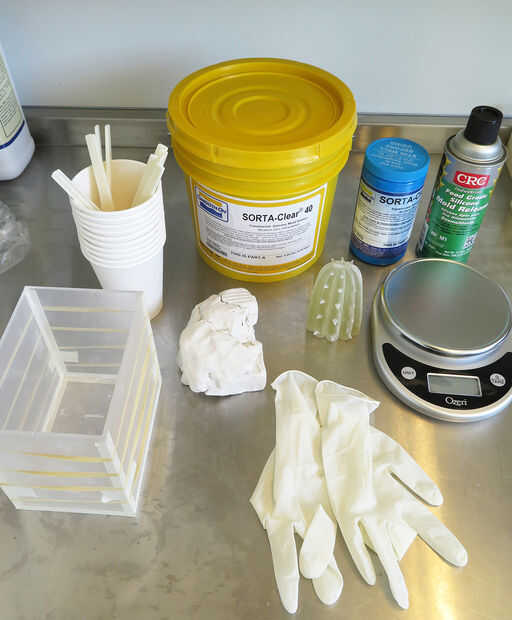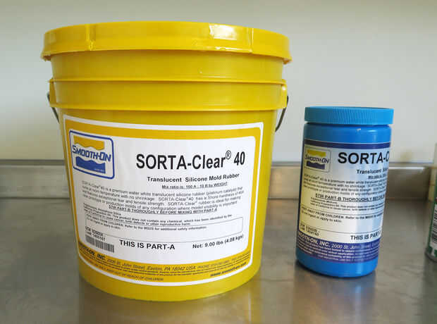Smooth-on ofrece una amplia gama de productos de silicona, pero para comida segura aplicaciones allí son tres tipos: Smooth-Sil® 940, el Sorta Clear® y la serie del® de Equinox. De los tres sólo la Sorta Clear® serie es translúcido (como su nombre indica, es de claro), que es muy útil cuando la visibilidad del modelo es importante. Aquí estoy usando poco clara 40, la más dura en la Sorta Clear® de la serie. La mezcla de un (cubo amarillo) y B (botella azul) es 100:10 en peso. Usted necesitará una báscula digital que tiene al menos un dígito después de cero.