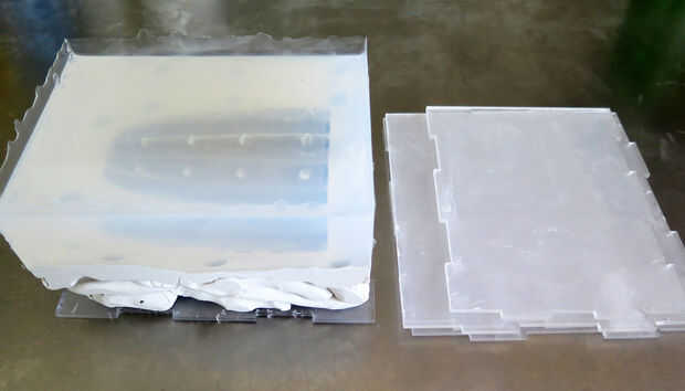 Cuando el segundo que medio curado, desmontar la caja de moldeo y podrá sacar un molde de silicona de dos partes que se alinea perfectamente a través de las claves del registro. Sin embargo si su desmoldeo no (que a mi me pasó), acabarás con un bloque grande de silicona porque las dos partes se pegan uno al otro.