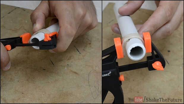 Cuando se superpone el palito, fijarlo con la abrazadera a la tubería y dejar que se seque.