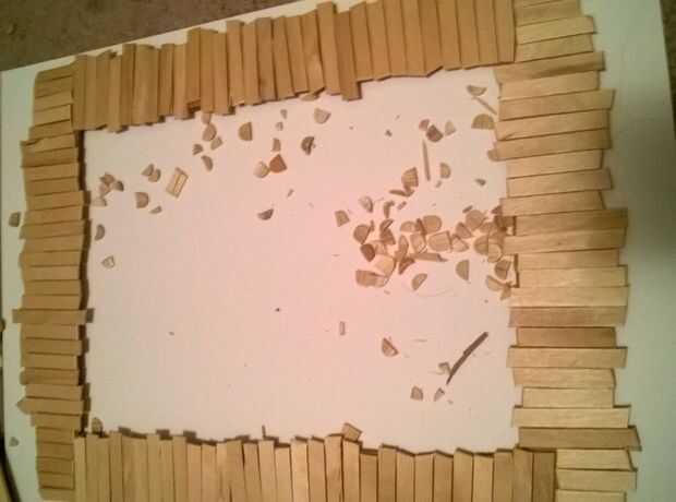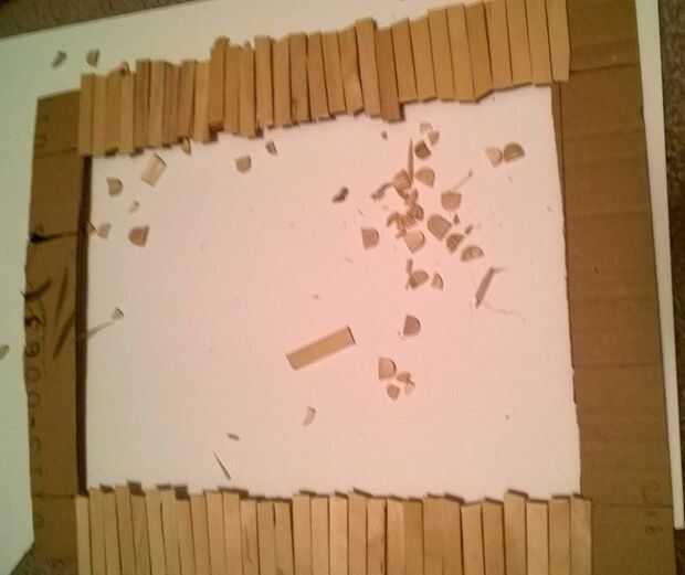 Como cortar los palillos los ponen hacia fuera en el marco para colocar donde quieras que vayan. Evitar pegar hasta que todas las piezas se cortan, así que puedes moverte por piezas hasta que un campista feliz. Dejar las esquinas hasta el final.