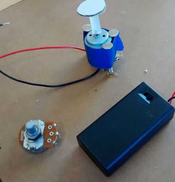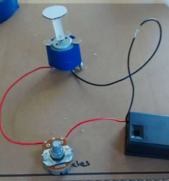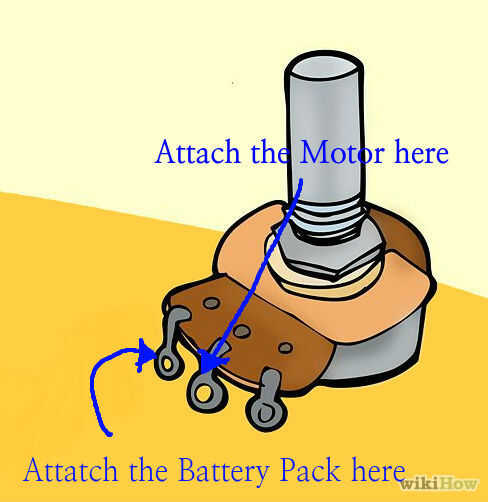 Coloque la batería en el soporte de la batería y conecte el extremo positivo del soporte de la batería a la entrada de la derecha del potenciómetro. Tome el cable positivo del motor y conecte a la entrada del centro del potenciómetro. Conecte los dos cables restantes juntos y apague su potenciómetro girando el eje de centro. Cinta todos los cables y la caja de la batería sobre la cartulina y pegamento caliente el potenciómetro a la cartulina.